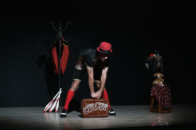 Mostrandoci diverse discipline circensi come il clown e il mimo, ci fa divertire con la sua valigetta magica dalla quale tira fuori inaspettate gag, creando pian piano un ambiante di circo dove il pubblico se diverte e si sente a proprio agio.