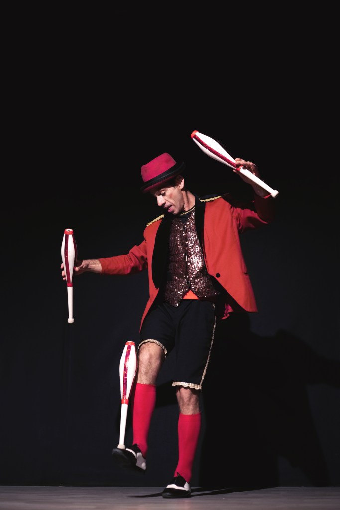 In questo spettacolo Hiram ci fa sentire come se fossimo in un circo, dalle sue musiche, al suo costume, fino agli oggetti di scena.